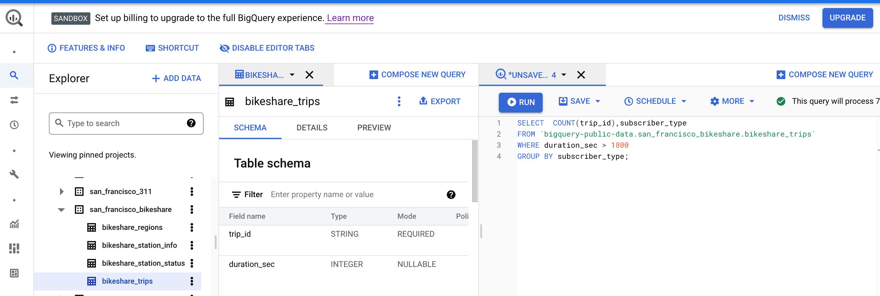 In the right upper corner, there is a tip, if the query is written correctly, we see a green check and how many Mib this query will be processing. If something is not correct, then it will tell us, at what row there is the mistake. When we are ready, just press “Run”. I tried to find the number of customers, who rent a bike for longer than 30 mins per trip and grouped them according to subscriber type with this SQL query:
