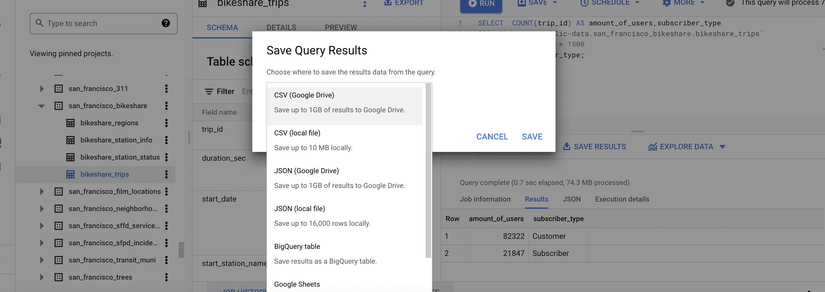 Clicking “Save results” gives us options to save it like .csv file, .json, google drive, and so on for further work with it. Also, we have an option here to save our query or the view, and to schedule our query, which could be convenient, if we were working with the dataset that constantly updates.