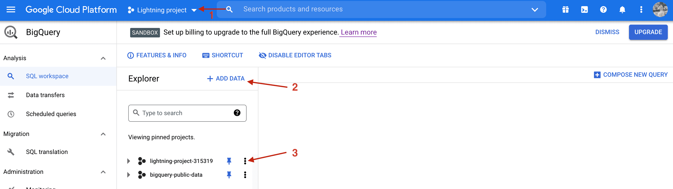 As soon as we are logged in, in the Navigation menu (upper left corner), under the BigQuery we need to choose SQL Workspace. And that’s what we see then: