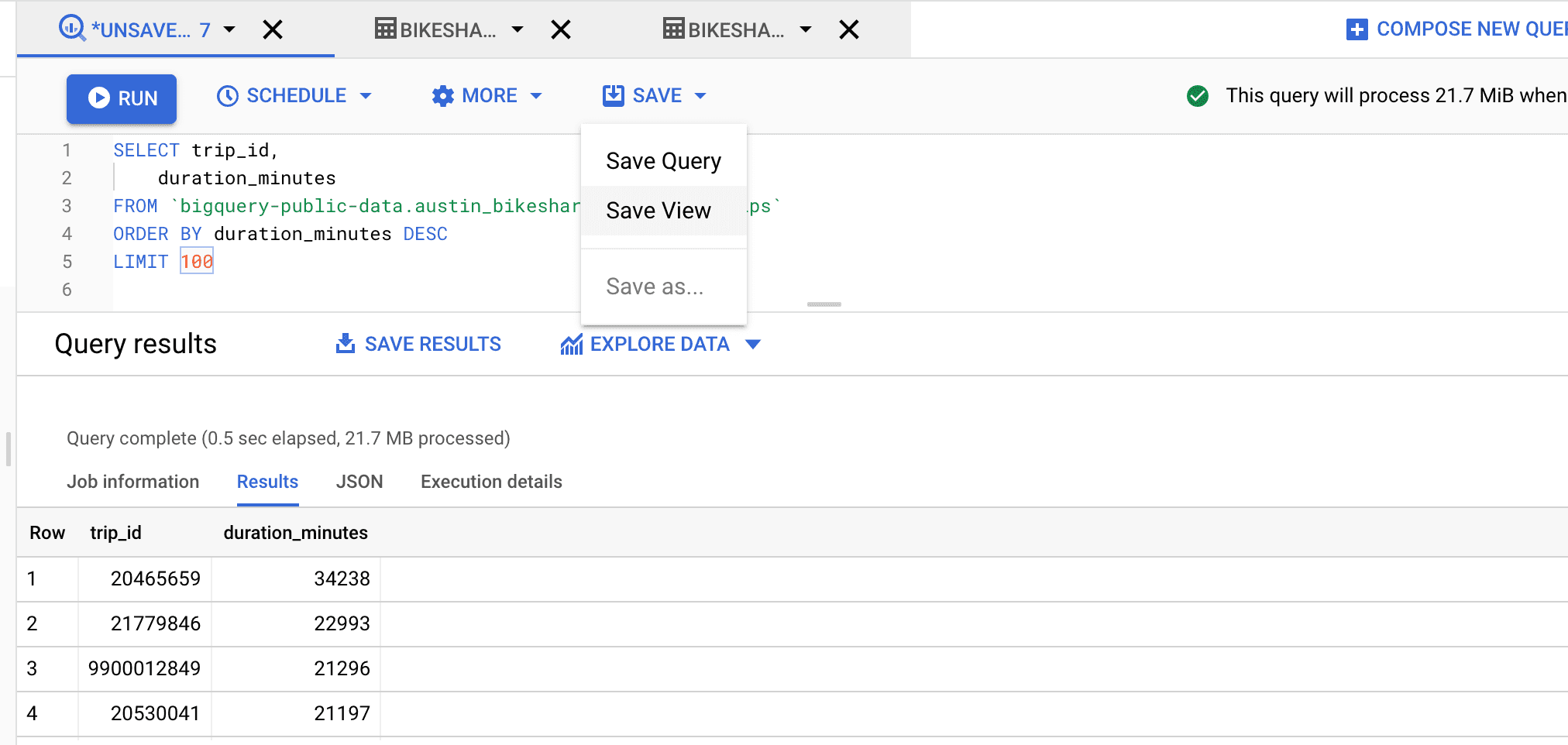 Another way to make our queries easier is to use a view in BigQuery. A view is a virtual table with data, where the content is defined by a SQL query. It means, as with the temporary table, we write a query that describes which columns from which tables and under what conditions we call. Then we save it using the 'save' -> 'save view' buttons, where we define where exactly we save this view. When it is successfully saved, we can use it as a normal table in our SQL queries.