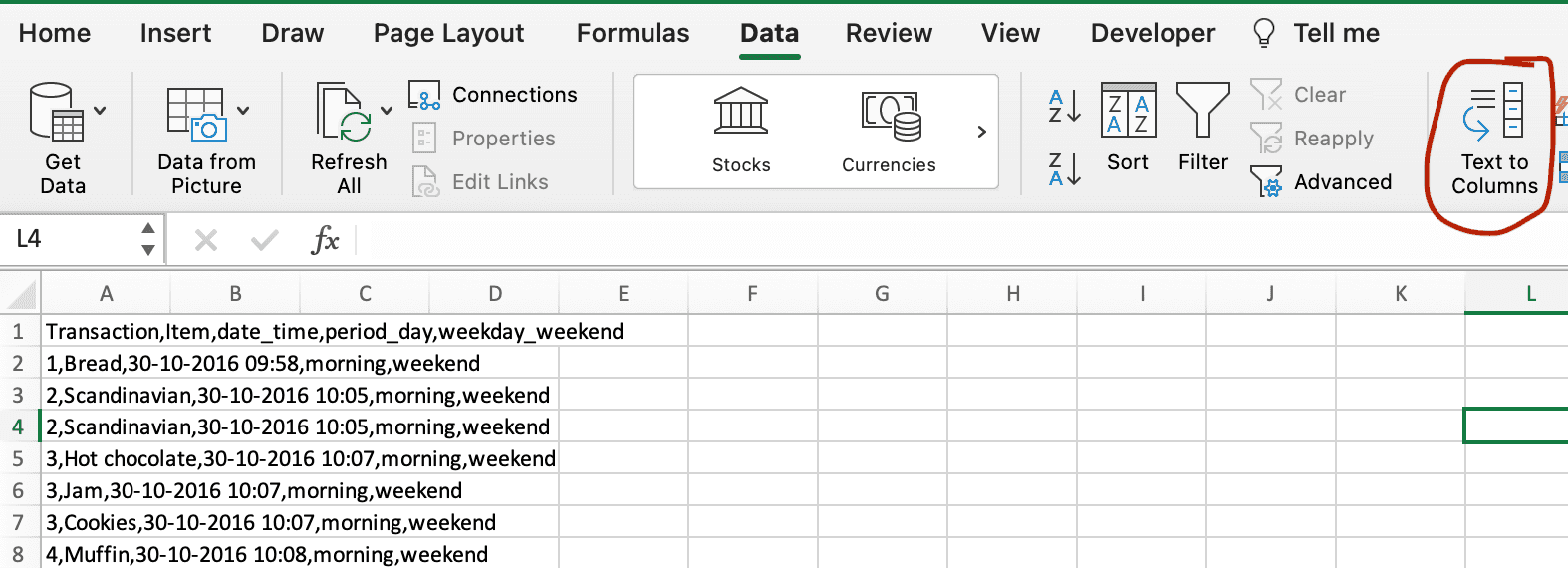 As I was learning, I've often encountered files with a .csv extension. There is one quick and effective way to work with them more conveniently in Excel. When we open such a file, we see the data without distribution into columns.