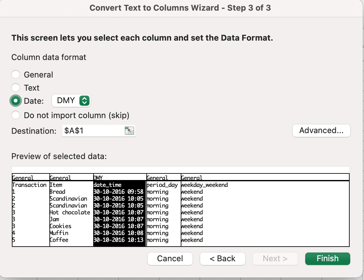 In the next step, we can specify the data type for each column or just leave it the general type. My advice is to specify the Date data format for your date and time data. Otherwise, it may be imported into the table in text format, which will cause some additional work. And that’s all about importing .csv files into Excel.